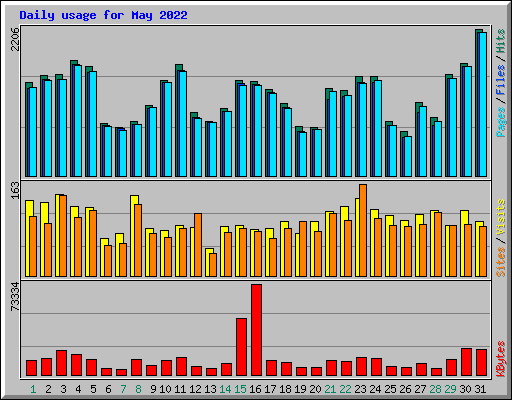 | Day | Hits | Files | Pages | Visits | Sites | KBytes | ||||||